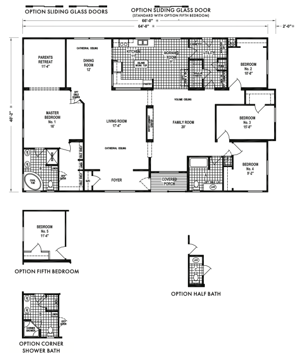 B361CT This 2550 square foot four-bedroom, two-bath home features a formal foyer, a spacious living and family room area, a traditional style kitchen and dining area with a split-bedroom style that is perfect for a large family. Additionally, this plan offers pre-engineered floorplan modifications to add a half-bath, a fifth bedroom or an alternative master bath. The Sunset Ridge series has standard hardwood cabinetry, most interior doors are 36”, radius drywall corners, side eaves and overhangs, 2x6 exterior window trim and exterior shutter treatments to the windows on the front door side.