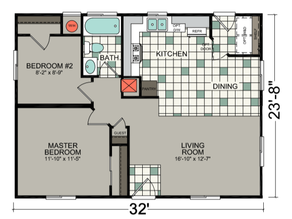 The Bradford 02 is one of our smaller house plans. Although the home is under 800 square feet, a creative and efficient use of space make it seem larger than it is. This open concept floorplan features two bedrooms, one bath, a kitchen, living room, and even its own laundry room. You might consider this home to downsize, to use as a vacation home in some beautiful snowy area, or as an affordable way to place an accessory dwelling unit into your backyard as housing for family members, friends, students, or renters. Small house plans are an affordable choice … they offer lower maintenance costs and do not require much energy to heat and cool. Although the home already features a seven-year Silvershield warranty, hardwood cabinetry, Corian countertops, crown molding, sculpted cased windows and baseboards, etc., you can further customize both the interior and exterior to your liking. Whether you want a truly simple and cost-effective home or one with luxurious amenities this could be the home for you!