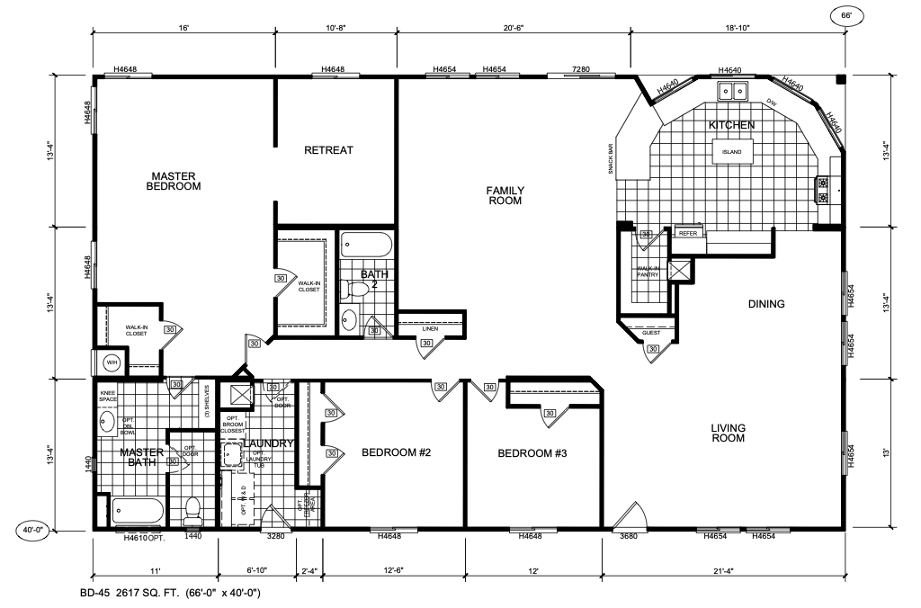 The Bradford 45 is 2617 square feet laid out in an exquisite design featuring two-bathrooms and three-bedrooms - the master bedroom has a large retreat area. This house offers both a large living and family room. The well-lit family room opens to a large curvaceous kitchen embedded with windows adding to the brightness and fluidity of the design. The master suite offers dual walk-in closets. The laundry room is spacious enough to fit a laundry tub, broom closet and a separate freezer. The home also offers significant storage space, i.e., linen closets, guest closet, and a spacious kitchen pantry. The Bradford 45 offers pre-engineered design modifications to the master bedroom ensuite, and the hall bath. Although the home already features a seven-year Silvershield warranty, hardwood cabinetry, Corian countertops, crown molding, sculpted cased windows and baseboards, etc., you can further customize both the interior and exterior to your liking.