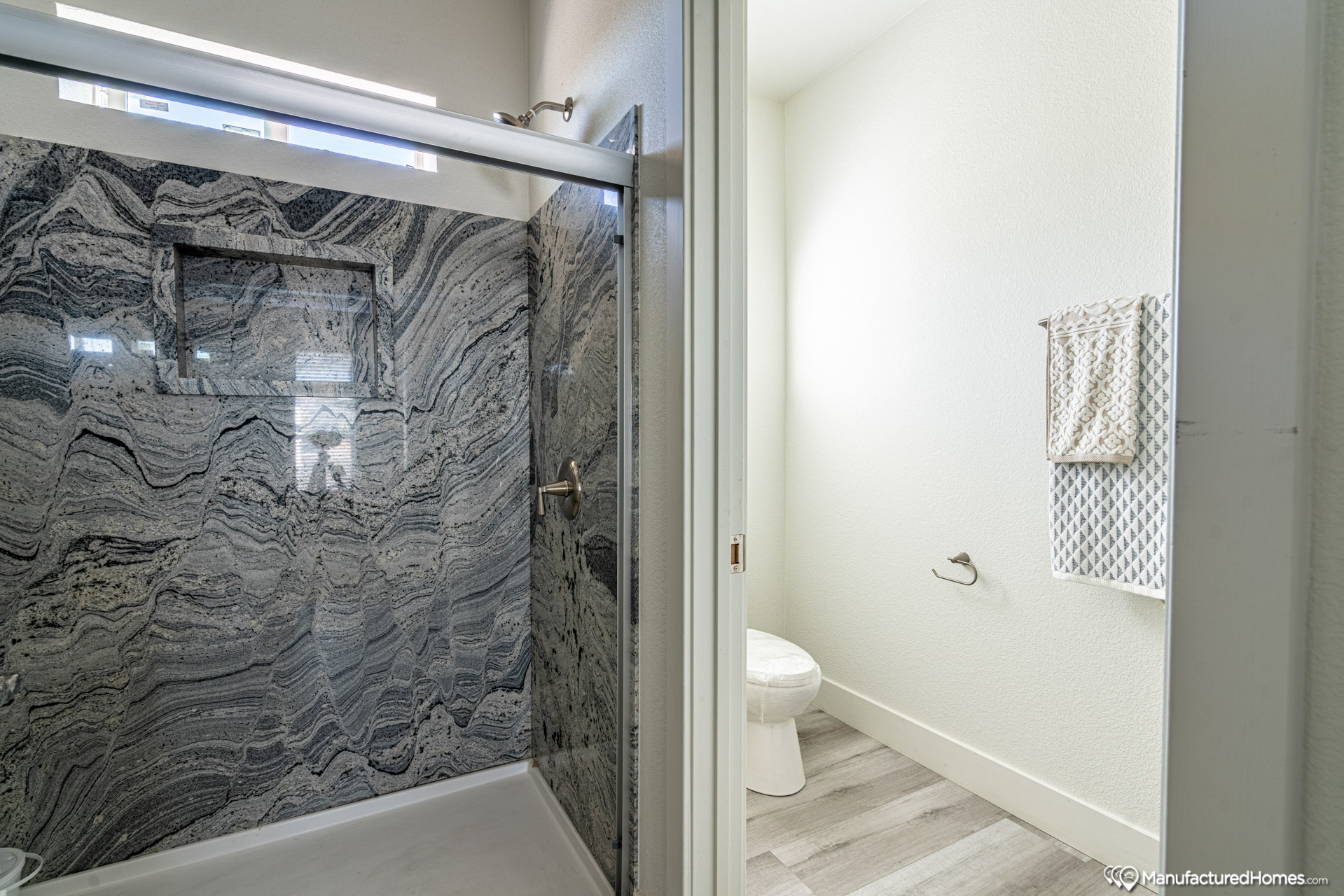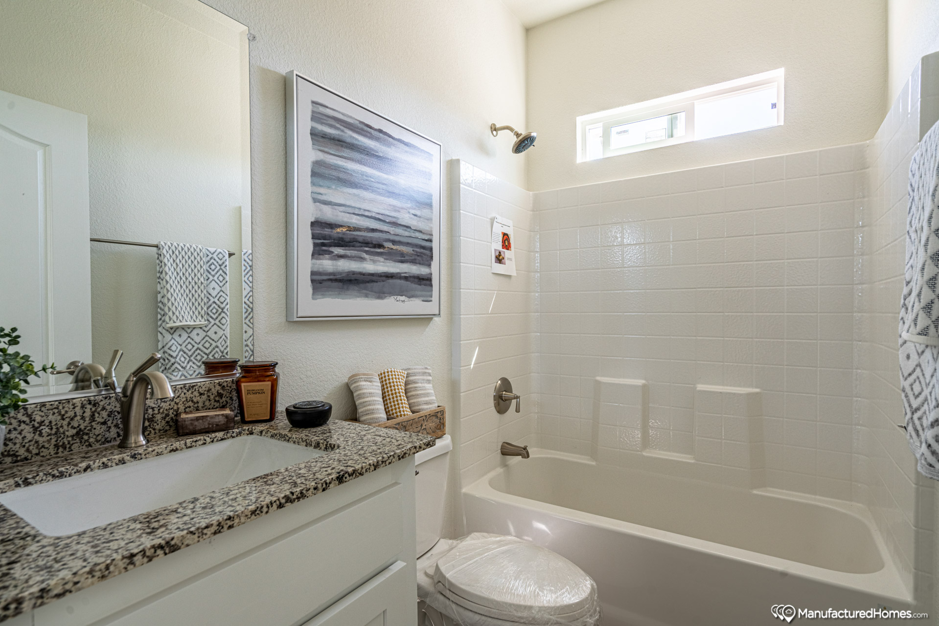 • 60″ Walk-in Fiberglass Shower (Master), 1-Piece Fiberglass Tub/Shower (Guest Bath)