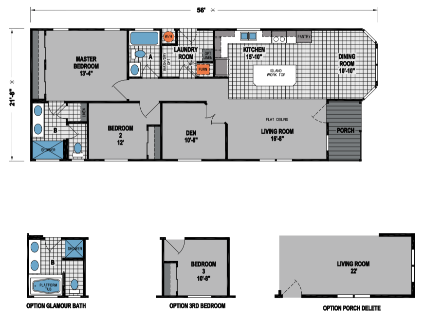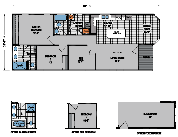The K300H is a 1144 square foot home featuring, a porch, two-bedrooms, a den and two-bathrooms. The K300H is an identical design to the K300G only you can choose between several stunning optional exterior packages for this home. Please ask your sales agent to show you the Baypoint, Newport, Artisan and Hampton exterior elevation packages. This home has 9’ sidewalls and an open-concept design. You might consider this home as a primary residence, a vacation home, or as an affordable way to place an accessory dwelling unit into your backyard as housing for family members, friends, students, or renters. This home offers several pre-engineered floorplan designs, including a glamour bath, optional third bedroom or you can even convert the porch to living area. This plan is a design belonging to the Sunset Ridge series of homes. Each plan in the Sunset Ridge series embodies open concept living and comes with 9’ sidewalls, upgraded exterior window trim, side eaves and overhangs, hardwood cabinetry with 42” overheads, crown molding at the kitchen, dining room, and hallway, choice of interior wall paint color with white ceilings, wide hallways, recessed can lights, subway tile backsplashes and much more.