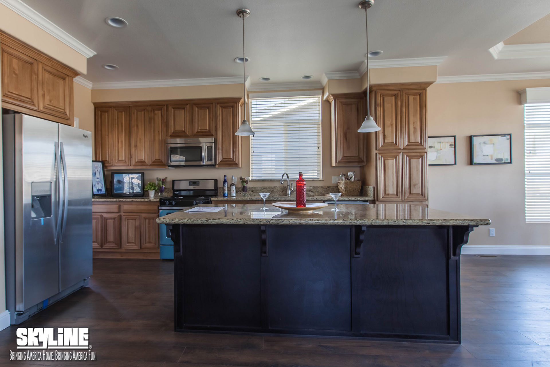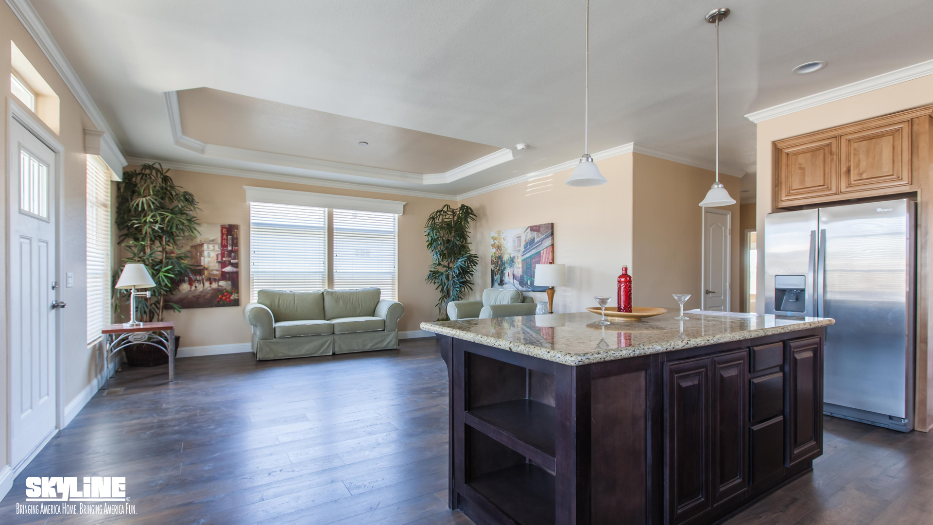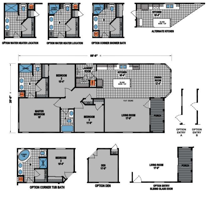 The K517H is a 1528 square foot home featuring, a porch, three-bedrooms and two-bathrooms. This plan has 9’ sidewalls and an open-concept design. This home is available with several stunning optional exterior upgraded elevations. Please ask your sales agent to show you the Baypoint, Newport, Artisan and Hampton exterior elevation packages. The laundry room features a spacious walk-in pantry. This home offers several pre-engineered floorplan designs, including a den, optional entryway, deluxe bathroom, alternative water heater positions, and an alternate kitchen. This is a design belonging to the Sunset Ridge series of homes. Each plan in the Sunset Ridge series embodies open concept living and comes with 9’ sidewalls, upgraded exterior window trim, side eaves and overhangs, hardwood cabinetry with 42” overheads, crown molding at the kitchen, dining room, and hallway, choice of interior wall paint color with white ceilings, wide hallways, recessed can lights, subway tile backsplashes and much more.