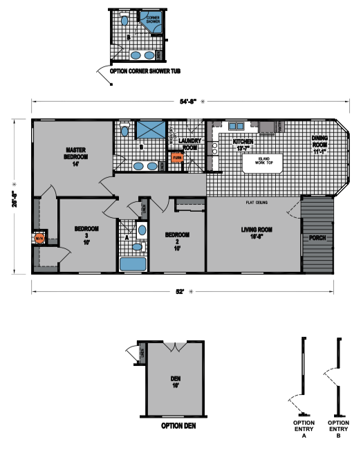 The K530H is a 1421 square foot home featuring, a porch, three-bedrooms and two-bathrooms. This plan has 9’ sidewalls and an open-concept design. This home is available with several stunning optional exterior upgraded elevations. Please ask your sales agent to show you the Baypoint, Newport, Artisan and Hampton exterior elevation packages. This home offers several pre-engineered floorplan designs, including an enlarged living room, an alternate master bathroom or a den. This is a design belonging to the Sunset Ridge series of homes. Each plan in the Sunset Ridge series embodies open concept living and comes with 9’ sidewalls, upgraded exterior window trim, side eaves and overhangs, hardwood cabinetry with 42” overheads, crown molding at the kitchen, dining room, and hallway, choice of interior wall paint color with white ceilings, wide hallways, recessed can lights, subway tile backsplashes and much more.