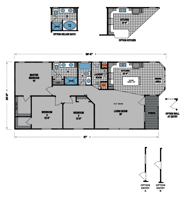 The K535H is a 1497 square foot home featuring, a porch, three-bedrooms and two-bathrooms. This plan has 9’ sidewalls and an open-concept design. This home is available with several stunning optional exterior upgraded elevations. Please ask your sales agent to show you the Baypoint, Newport, Artisan and Hampton exterior elevation packages. This home offers several pre-engineered floorplan designs, including optional entryways, an alternative kitchen and master bath design. This is a design belonging to the Sunset Ridge series of homes. Each plan in the Sunset Ridge series embodies open concept living and comes with 9’ sidewalls, upgraded exterior window trim, side eaves and overhangs, hardwood cabinetry with 42” overheads, crown molding at the kitchen, dining room, and hallway, choice of interior wall paint color with white ceilings, wide hallways, recessed can lights, subway tile backsplashes and much more.