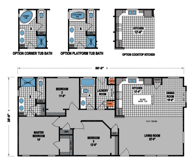 The K539G is a 1500 square foot home featuring, three-bedrooms and two-bathrooms. This plan has 9’ sidewalls and an open-concept design. The dining room has a gorgeous box-bay window. This home offers several pre-engineered floorplan designs, including an alternative kitchen and master bath design. This is a design belonging to the Sunset Ridge series of homes. Each plan in the Sunset Ridge series embodies open concept living and comes with 9’ sidewalls, upgraded exterior window trim, side eaves and overhangs, hardwood cabinetry with 42” overheads, crown molding at the kitchen, dining room, and hallway, choice of interior wall paint color with white ceilings, wide hallways, recessed can lights, subway tile backsplashes and much more.