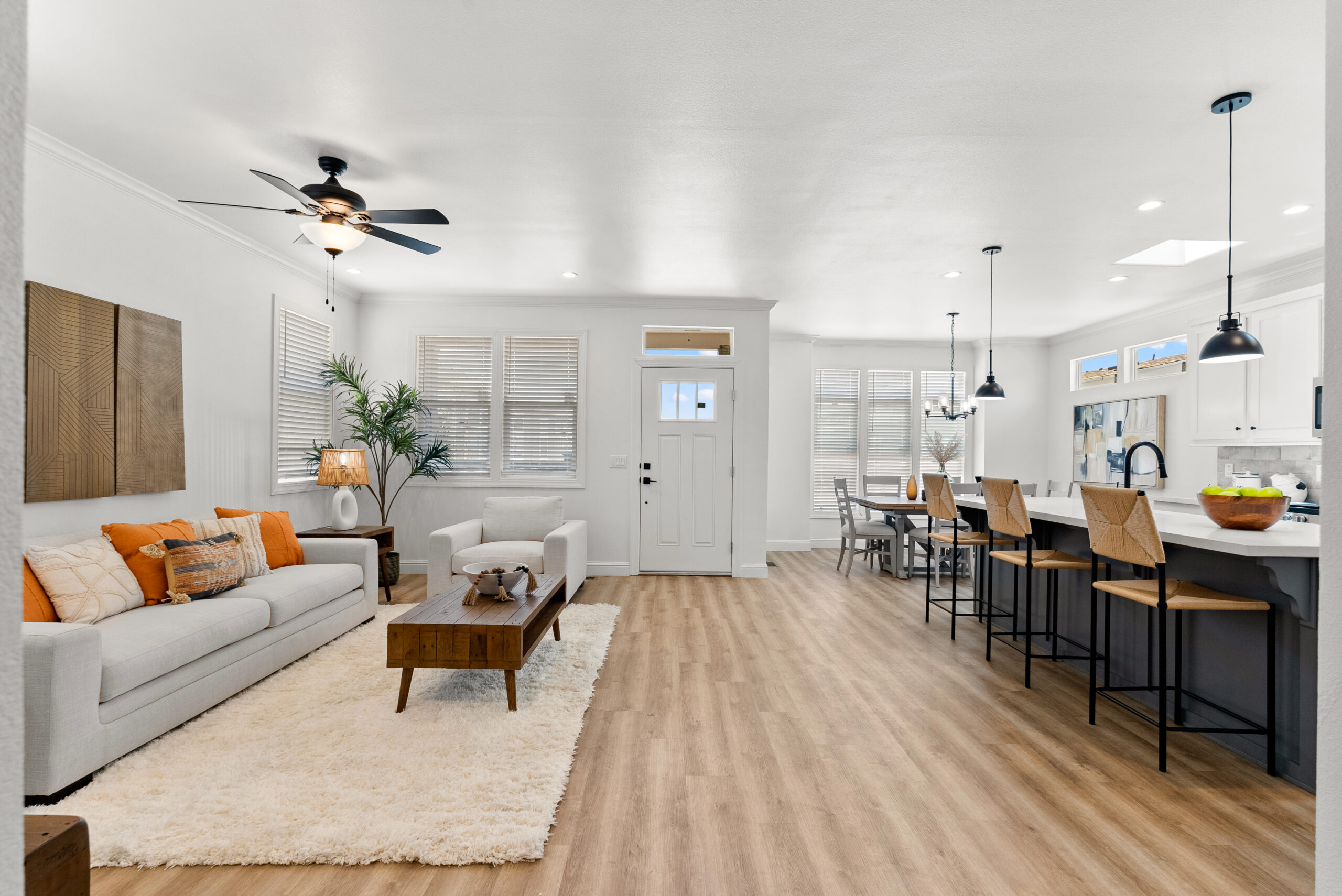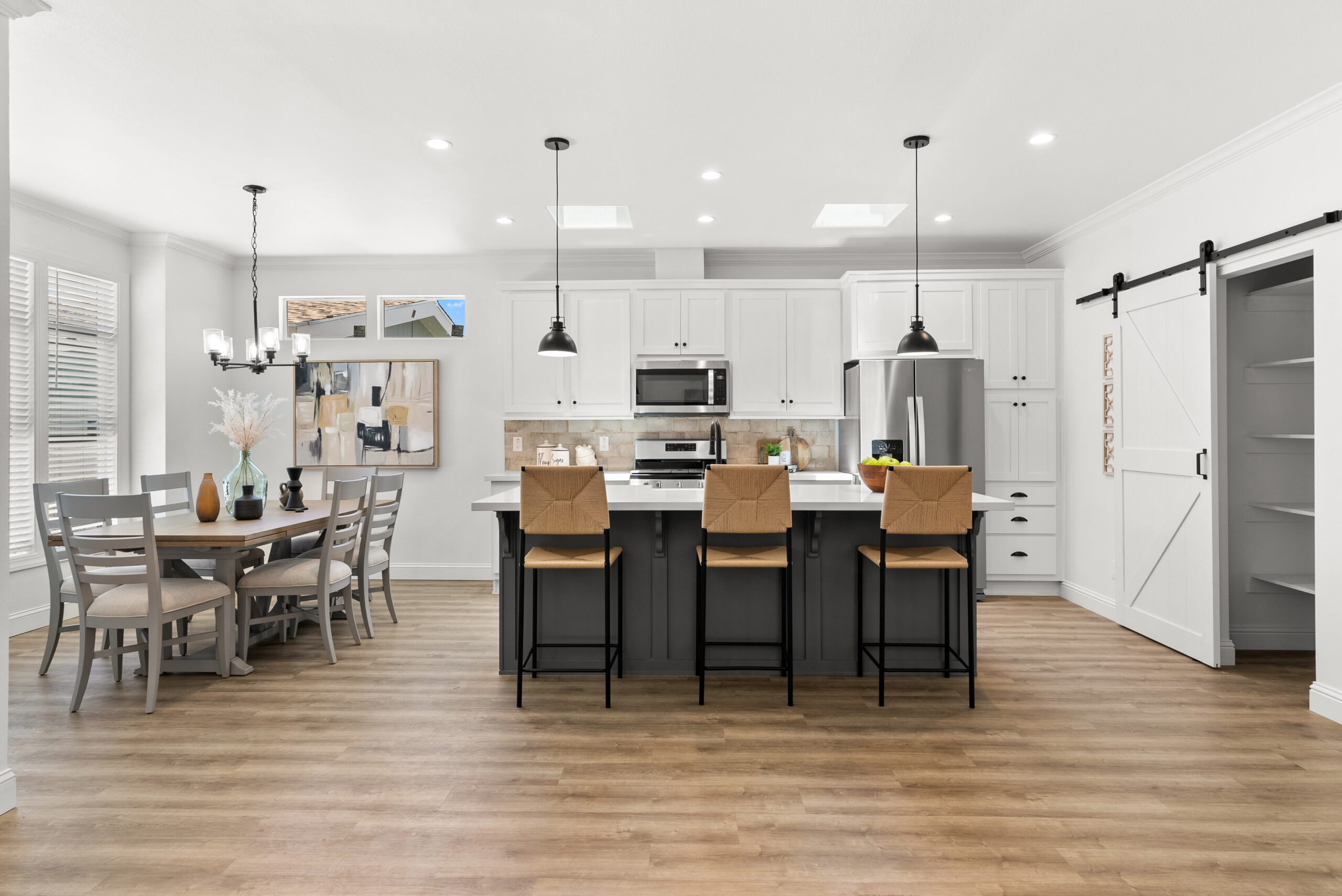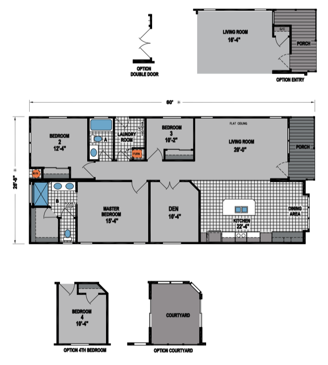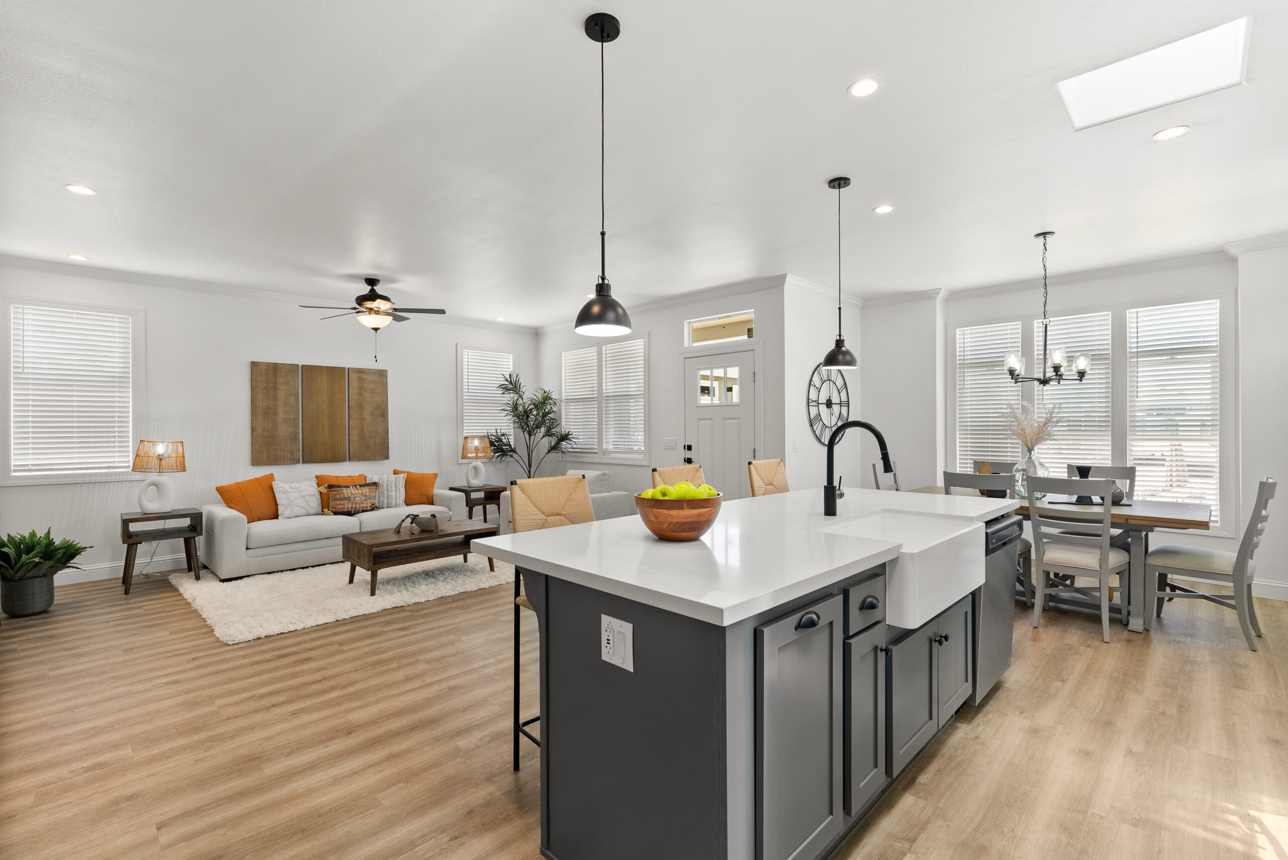 The K596G is a 1495 square foot home featuring, a porch, three/four bedrooms and two-bathrooms. This plan has 9’ sidewalls and an open-concept design. The dining room has a gorgeous box-bay window. This home offers several pre-engineered floorplan designs, including an optional courtyard, and wrap around porch. This is a design belonging to the Sunset Ridge series of homes. Each plan in the Sunset Ridge series embodies open concept living and comes with 9’ sidewalls, upgraded exterior window trim, side eaves and overhangs, hardwood cabinetry with 42” overheads, crown molding at the kitchen, dining room, and hallway, choice of interior wall paint color with white ceilings, wide hallways, recessed can lights, subway tile backsplashes and much more.
