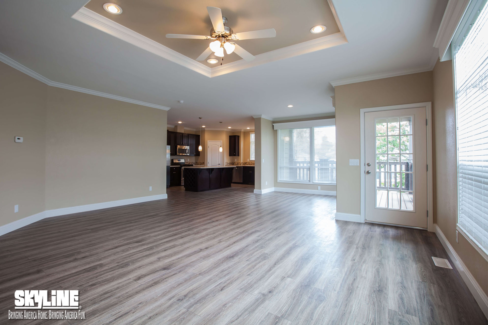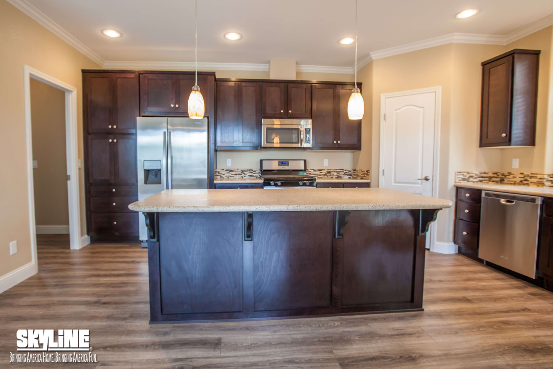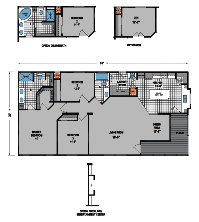 The K900G is a 1688 square foot home featuring, a wraparound porch, three bedrooms and two-bathrooms. This plan has 9’ sidewalls and an open-concept design. The kitchen has a gorgeous box-bay window. This home offers several pre-engineered floorplan designs, including an optional deluxe bathroom, and optional den. This is a design belonging to the Sunset Ridge series of homes. Each plan in the Sunset Ridge series embodies open concept living and comes with 9’ sidewalls, upgraded exterior window trim, side eaves and overhangs, hardwood cabinetry with 42” overheads, crown molding at the kitchen, dining room, and hallway, choice of interior wall paint color with white ceilings, wide hallways, recessed can lights, subway tile backsplashes and much more.