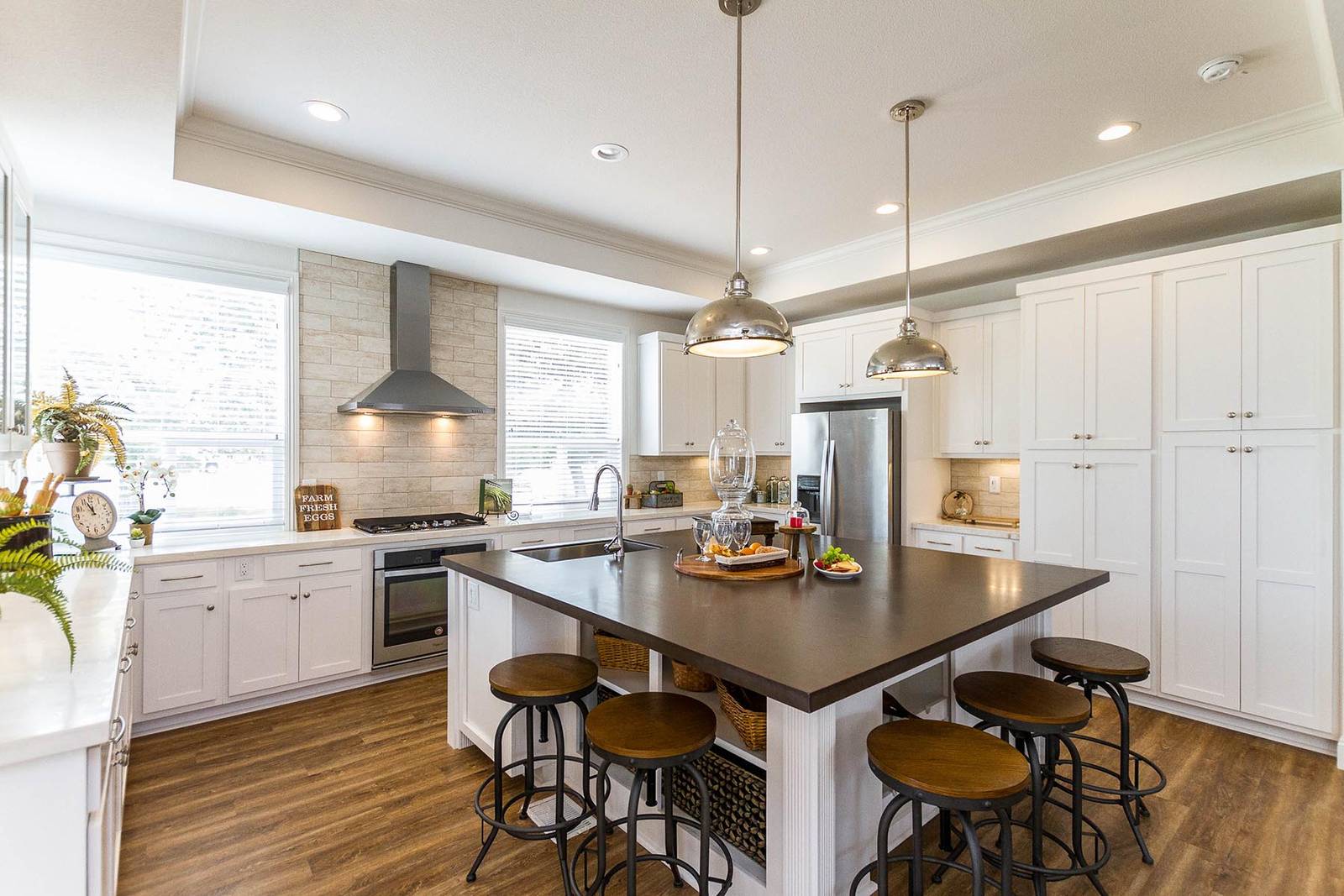 The Kingsbrook 34 is a 1,805 square foot open concept plan that offers a split-bedroom style and features three-bedrooms, two-bathrooms, a large master suite, a laundry room and a spacious great room, and kitchen. Although this house is not huge it satisfies all your essential needs. The creative use of space together with the 9’ tall ceilings and stacked windows certainly make the home bright and it feels bigger than it is. Although the home already features a seven-year Silvershield warranty, hardwood cabinetry, Corian countertops, crown molding, sculpted cased windows and baseboards, etc., you can further customize both the interior and exterior to your liking.